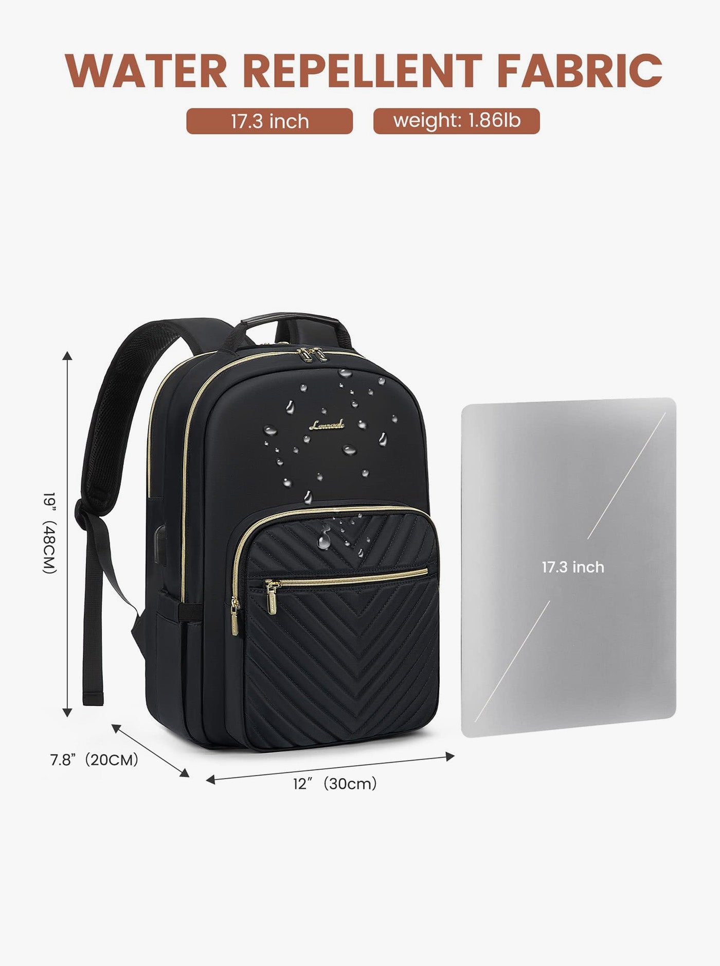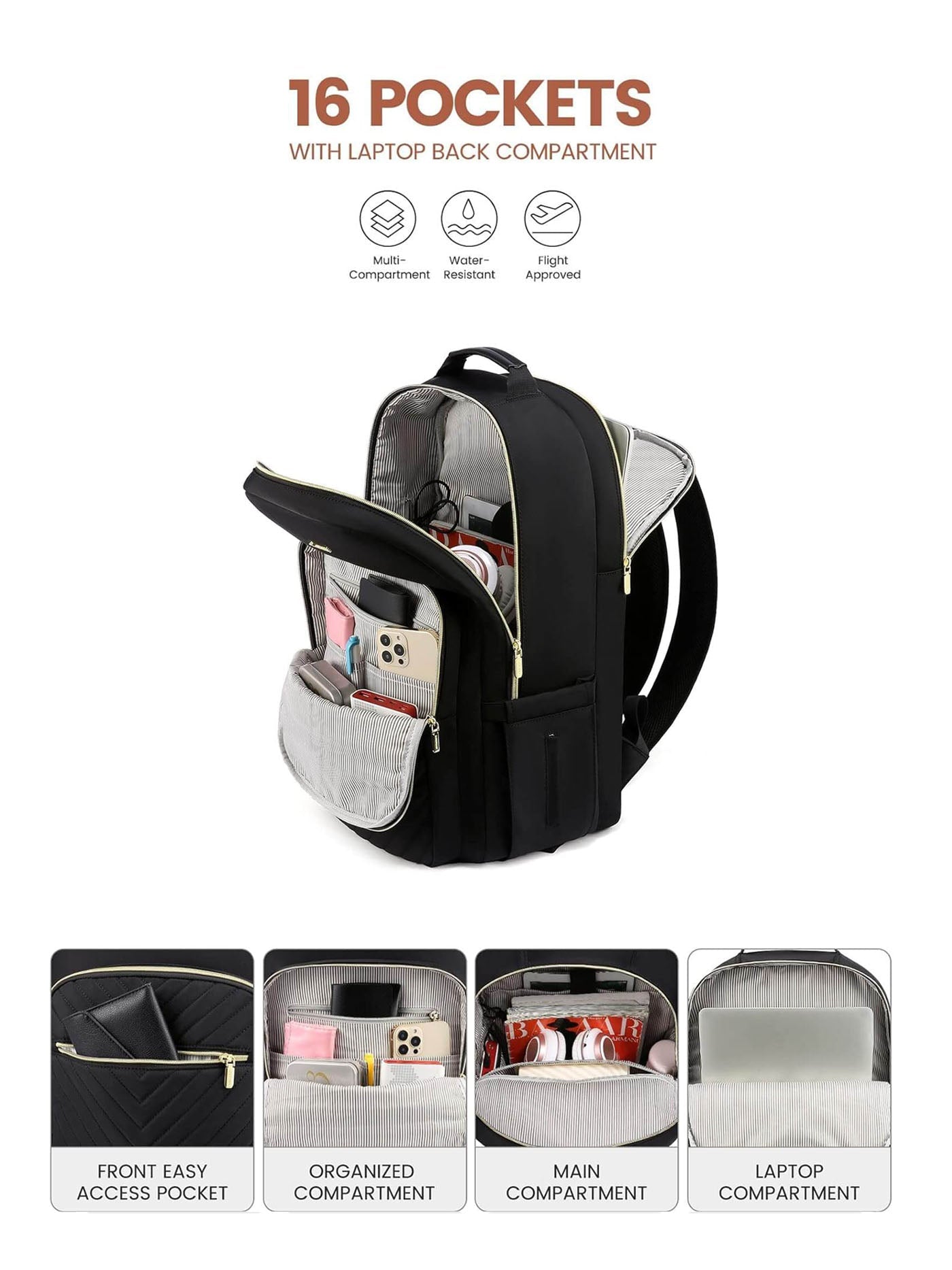 The LOVEVOOK Large Travel Backpack has proven to be an indispensable companion for my on-the-go lifestyle. This backpack effortlessly blends style, functionality, and ample storage, making it a must-have for women who value both fashion and practicality.One of the standout features of this backpack is its 17.3-inch laptop compartment. It's rare to find a travel backpack that not only accommodates larger laptops but does so with a dedicated and well-padded space. The laptop compartment provides secure protection, giving me peace of mind when carrying my valuable tech essentials.The overall design of the backpack is chic and modern. The sleek lines and thoughtful details add a touch of sophistication to my everyday look. The black color, coupled with the gold-tone hardware, creates an elegant aesthetic that pairs seamlessly with various outfits.The large capacity of the backpack is a game-changer. Whether I'm heading to work, a weekend getaway, or a day of exploration, there's ample room for all my essentials. Multiple compartments and pockets ensure optimal organization, and the front zippered pocket is perfect for quick access to items like keys or a phone.Comfort is not compromised in the pursuit of style. The padded shoulder straps and back panel make carrying this backpack a breeze, even when fully loaded. The ergonomic design distributes weight evenly, reducing strain on the shoulders and back – a crucial factor for those who are constantly on the move.Durability is another key feature. The sturdy construction and quality materials ensure that this backpack stands up to the rigors of daily use. It's water-resistant, providing an extra layer of protection for my belongings during unexpected weather conditions.The LOVEVOOK Large Travel Backpack strikes the perfect balance between fashion-forward design and practical functionality. It's an excellent investment for women who need a reliable and stylish companion for their daily adventures. Whether you're a professional, a student, or a traveler, this backpack effortlessly meets the demands of a dynamic lifestyle.In conclusion, the LOVEVOOK Large Travel Backpack is a standout choice for women seeking a spacious, stylish, and protective companion for their daily journeys. It has become an integral part of my routine, combining fashion and function seamlessly. Elevate your on-the-go style with this versatile and reliable travel backpack.