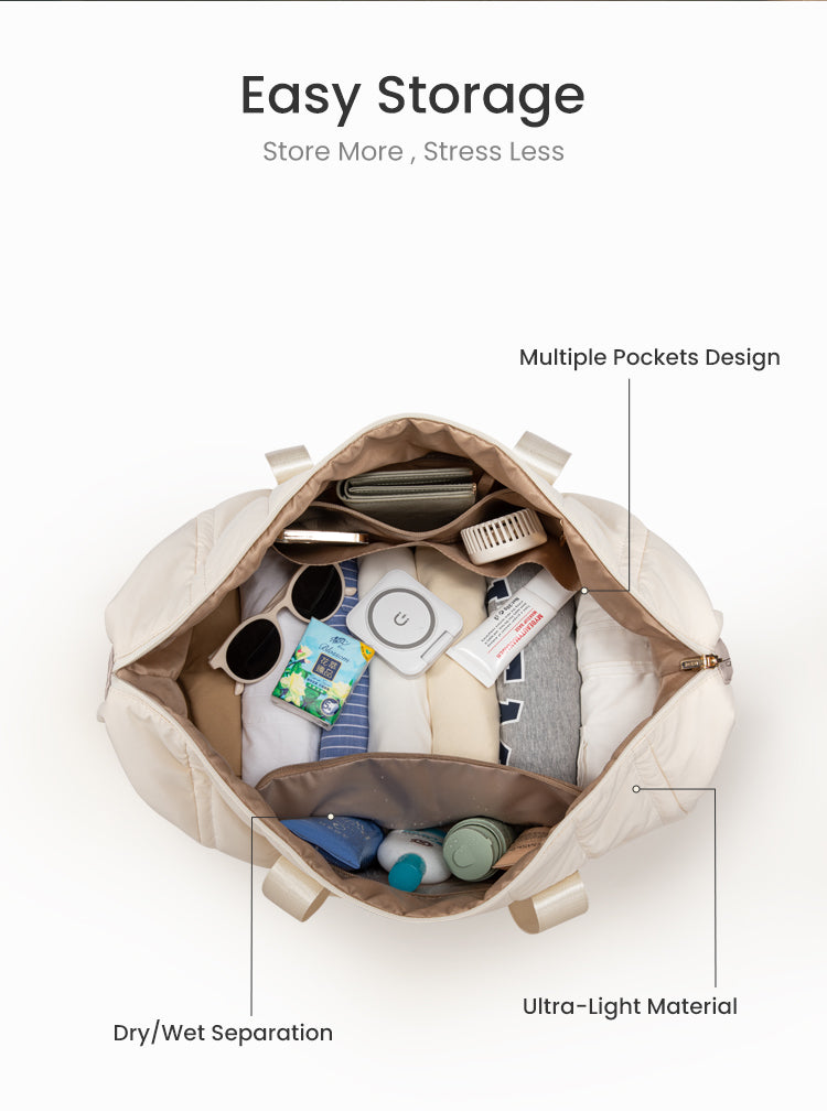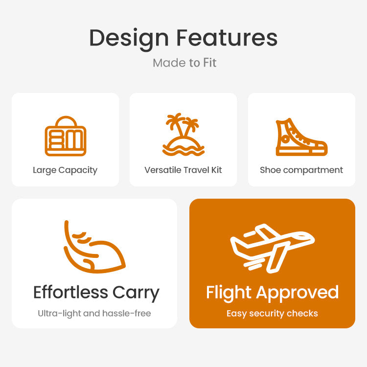 * Spacious main compartment — room for outfits, towels, makeup bag & more, 45L